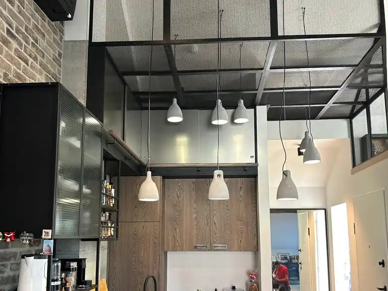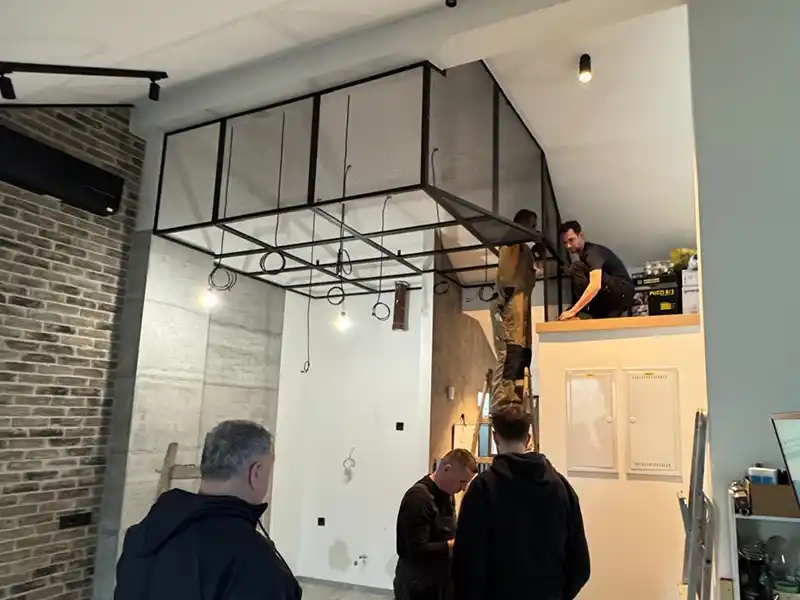 Završni rezultat je potpuno precizno izveden čelični spušteni strop industrijskog dizajna, gdje su svi elementi savršeno uklopljeni bez odstupanja.